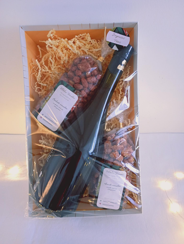 1 ballotins d'Amandes Caramélisées 200 grs + 1 ballotins de Cacahuètes Caramélisées 200 grs + 1 Btl de jus de pommes pétillant (possibilité de composer avec une autre bouteille).